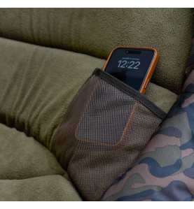 Okraj kresla je vyrobený z polyesterovej tkaniny Rip Stop Camo, disponujúci jednoduchou údržbou, vysokou životnosťou a je rýchloschnúci. Na údržbu postačí len vlhká handrička.